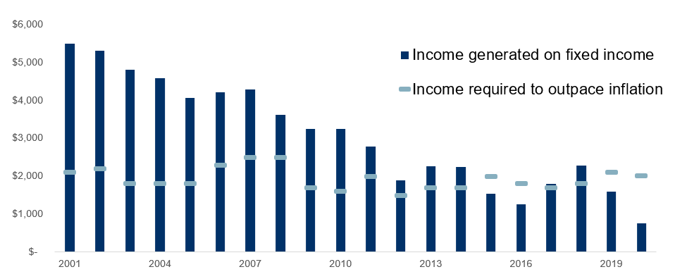 Data as of December 31, 2020. Source: Bloomberg, Bank of Canada, RBC GAM. Bond income based on annual yields for Government of Canada 10-year bonds. Inflation based on median core Consumer Price Index (CPI).