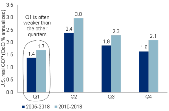- The calendar has now turned to the first quarter of the year – a period in which U.S. economic data has tended to be weirdly weak. Case in point, Q1 GDP growth was the weakest quarter of the year in each of 2016, 2017 and 2018. Not coincidentally, the second quarter of each of those years was subsequently the strongest as this distortion unwound. We call it “weird” because economic data is already seasonally adjusted to eliminate such patterns.