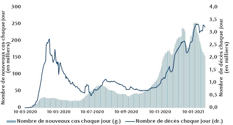 Au 31 janvier 2021. Moyennes mobiles sur sept jours du nombre quotidien de nouveaux cas et de décès. Sources : OMS, Macrobond, RBC GMA
