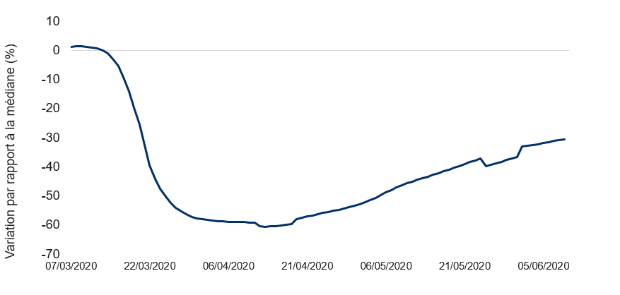 Nota : Au 7 juin 2020. Écarts avec le niveau de référence, normalisation par rapport aux États-Unis. Sources : Google, Université d’Oxford, Apple, Macrobond, RBC GMA