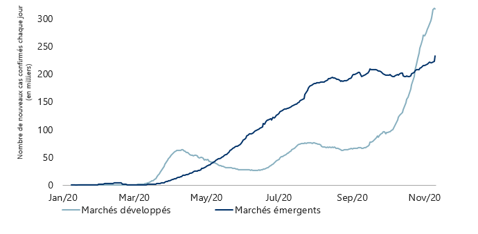 Bien que les résultats des élections aient suscité un vent d’optimisme à l’égard des actifs à risque, les données sur le virus continuent de pointer dans la direction opposée. À l’échelle mondiale, on compte plus de 500 000 nouveaux cas et 8 000 décès par jour (voir le graphique suivant).