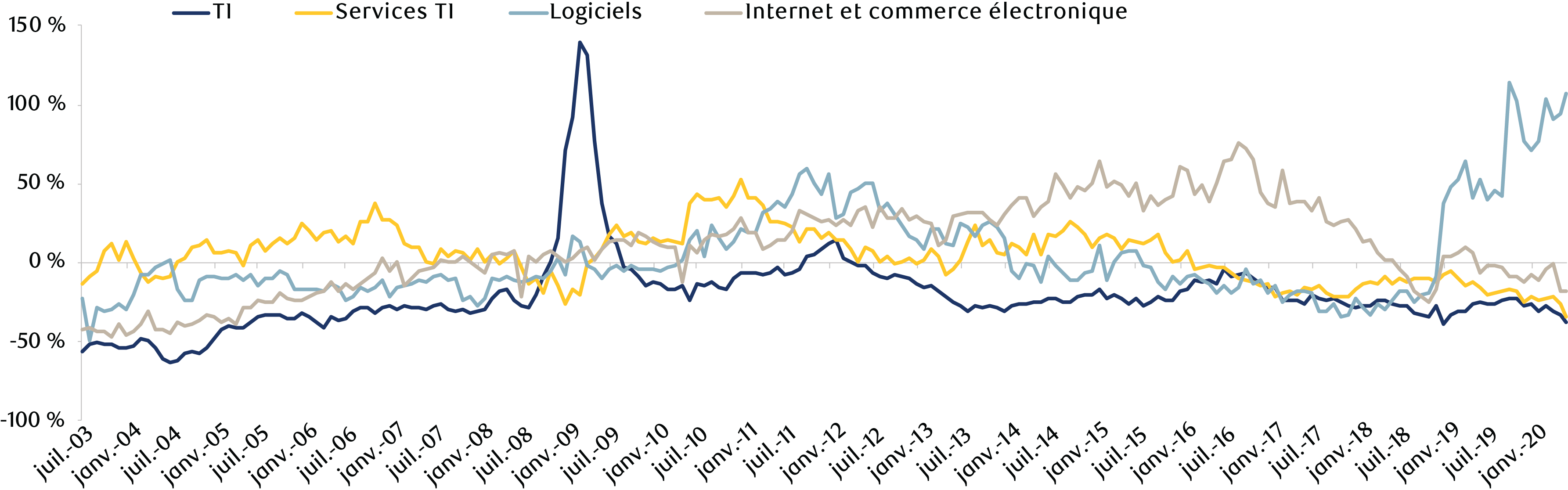 Source : RBC Gestion mondiale d’actifs. Bloomberg. Données en janvier 2020. Pondération du secteur de la TI + sous-secteur des médias et divertissements + sous-secteur du commerce de détail sur Internet et par marketing direct.